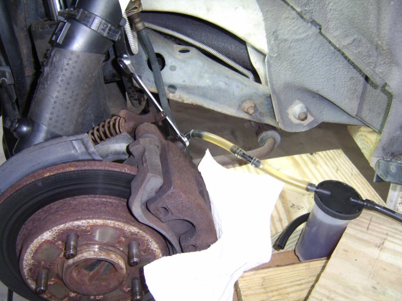 4. Bleeding the brakes: After suctioning the fluid out of the master reservoir, I turned on the key and let the pump prime back up, which took about 30 seconds. I then used Ronnie's modified trick of using a wooden stick with a flat end, in a "T" shape to put between the seat bottom and the brake pedal to keep pressure on the brake. With the key on, it was a breeze to bleed the back brakes......no pumping of the brake pedal up/down, but just letting the pump push the new fluid to the back calipers. Took a good amount before clear fluid started coming out, and just had to keep refilling the master reservoir numerous times to prevent any air getting into the system. Here is the front caliper: I tried leaving the key on and hoped that the motor would push fluid out like it did on the rear brakes. But I only got one push of fluid into the clear tube and then the flow stopped. So, this does require a second person to be the foot-stomper on the brake pedal. It seemed to work both ways.....with the key on and pump allowed to cycle, or with the pump off, and just using 100% foot pedal-pumps. Went to the last one (drivers side), and even after soaking the bleeder several days with PB Blast, it did not want to come loose. I even used a torch to heat up the caliper around it, but it still would not come loose......and it may be on the verge of stripping/busting in half. So, looks like a new caliper will be needed on this one. But good to learn how to bleed these Teves Anti Loc Brakes, and to have fresh fluid in most of the lines/calipers. Got to do other general repairs while the car is still up on jackstands, but will post if this solved the ABS warning light issue in the near future.
