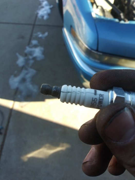 I FOUND THE PROBLEM!!!! I did what ronnie mentioned (can't believe I didn't think of it earlier) which was to pull each wire off until it doesn't make a difference to idle quality. So turns out, as a matter of coincidence, on cylinder 4 I had a bad spark plug wire so I swapped it with another set I bought from a 91. After I swapped the wire it started making a ticking sound. So I pulled the plug and found it was cracked down the insulator. I've never seen that before. I will attach a pic of the plug. On a side note if any one reading all this in the future is swapping over to the Delco ignition set up I HIGHLY recommend buying a spark plug wire set from a 91 reatta. They fit beautifully and make a nice solid connection.