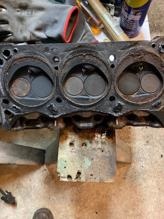 I then pulled the front head from the engine. The intake ports are full of junk and debris but the cylinders are fairly clean. The piston tops are dark but no huge deposits and I simply wiped them with a paper towel before photographing. I did the same for the cylinders, wiped them with a paper towel only. There is no discernable ridge at the top or scratches in the bores. The bores are stained and discolored but close inspection reveals the crosshatch is still visible. It would probably run just like it is but if this is to be put back in service, it will get a dingleberry hone job and new rings. No machine work. I didn't measure but the pistons are well below the top of the cylinder, probably .050" or more, so there is no squish or quench to enhance mixture motion. This is par for the course and the LN3 is the same way. In all other respects, these heads are no better or worse than the LN3. The only apparent difference, other than the rocker bolt threads is there is a hole in the wall that the intake bolts to to line up with the internal PCV system, the same as the L27 and all Series 1 engines. It is a simple matter to add this hole to an LN3 head. The chambers of the head are dirty and crusty and will take some cleanup to get a better handle on what shape they are in but I doubt any major problems.