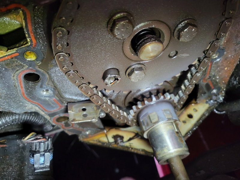 8. You can see what's left of the tensioner. The spring is laying on top of the oil pan.