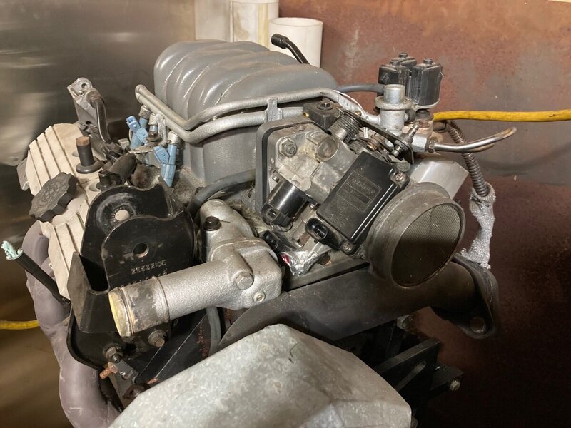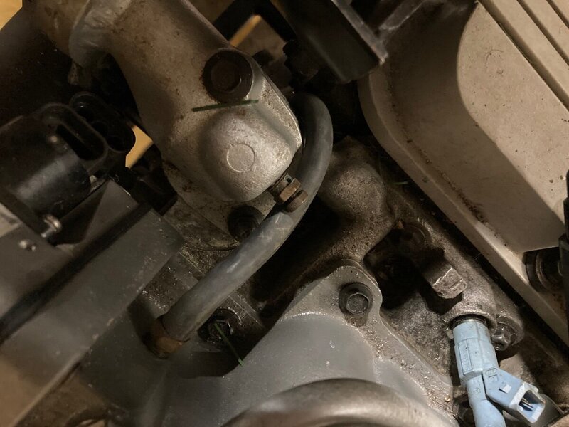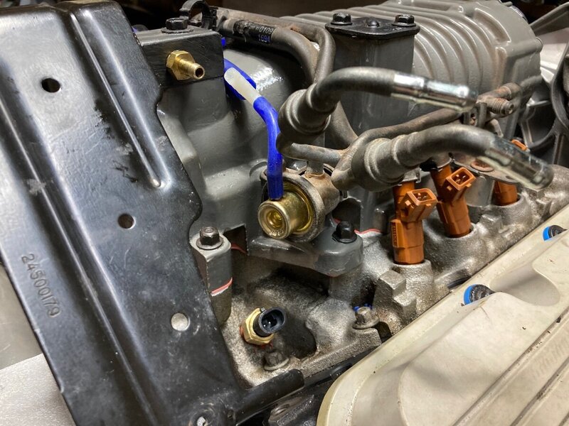 6. This is a rear view and the regulator lays on its side, small blue tube connected to it. The regulator itself is a little cartridge retained with a snap ring. The cylindrical housing is welded into the fuel rail. There are two views of the TPI manifold on my half turbo install. The fuel pressure regulator is the same type but it sits vertically visible in the upper right of photo. Also visible is a pipe plug in the top of the horizontal thermostat elbow and the other photo shows a bleeder in the back side of a similar elbow. It seems this style elbow, which just uses a conventional flat paper gasket, has a bleeder port somewhere as standard?