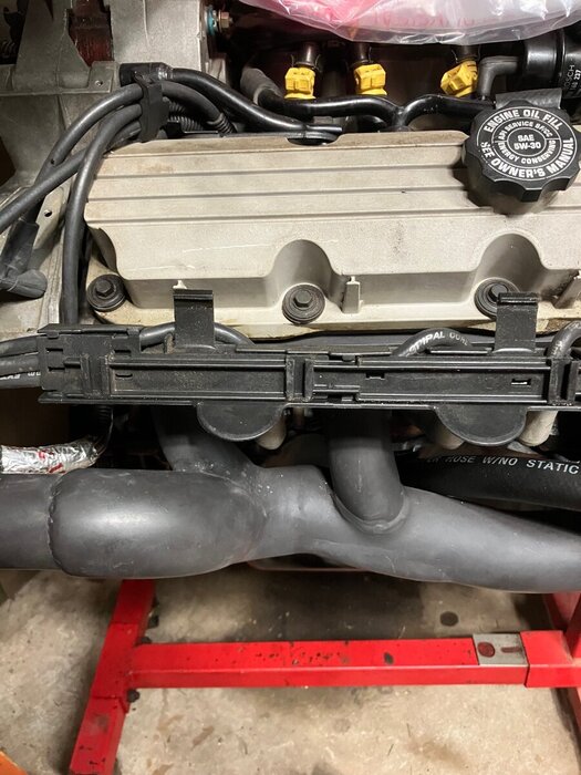 2. This is a photo of the two piece assembly upside down and inside out. The two rectangles standing upright from the top are latches that secure the entire assembly. There are three guides on the front of the valve cover with matching receiver grooves in the plug wire loom. You must release the latches which catch on the lower lip of the valve cover and the assembly slides up and off. One latch is in line with #1 plug and the second is between 3&5. A small pocket screwdriver works fine to release. After it is in hand, there is a latch on the right side that will allow the outer cover to slide toward the left to release the small catches and it folds open.